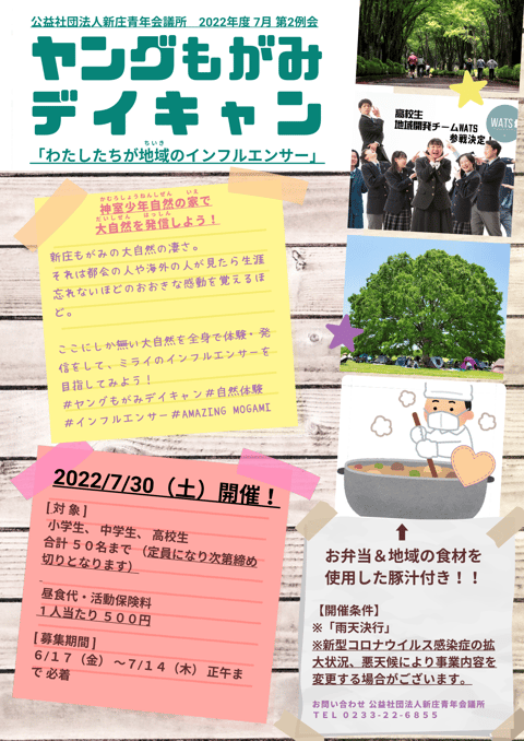 公益社団法人新庄青年会議所 2022年度 7月第2例会 ヤングもがみデイキャン「わたしたちが地域のインフルエンサー」のご案内 2022年7月30日(土)、神室少年自然の家(真室川町)にて、自然体験×SNS発信をテーマにした事業を開催致します。 対象は、新庄もがみ地域の小学生、中学生、高校生です。...