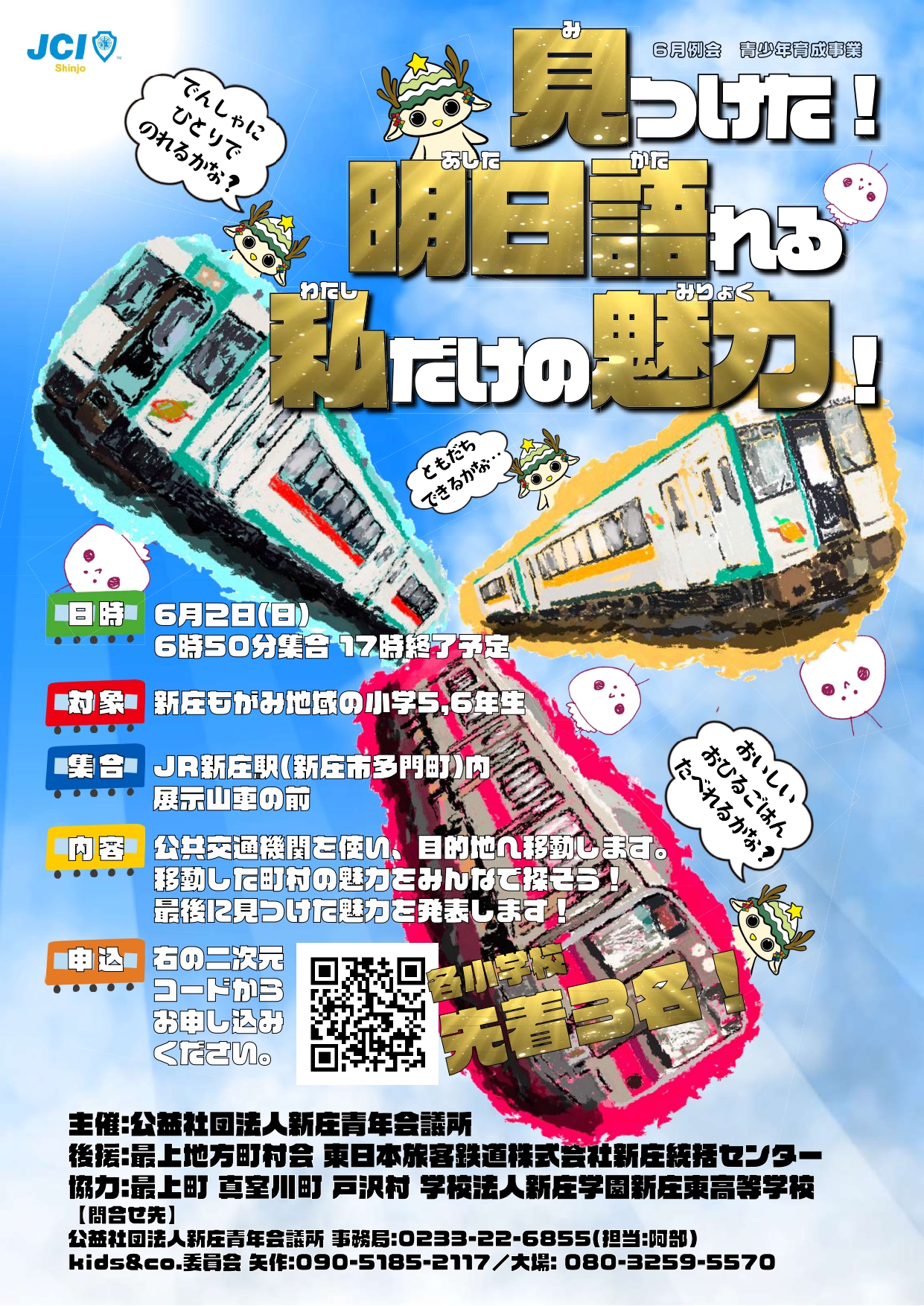 公益社団法人新庄青年会議所青年会議所 「6月例会 JRで巡る!明日語れる私だけの魅力発見ツアー」 参加者を再募集しています😖 日程:6月2日(日) 時間:6:50〜17:00予定 対象:新庄もがみ地域の小学5,6年生 集合場所:新庄駅展示山車前 内容:JRの電車やバスを使って真室川町、戸沢村、最上町の端っこまで行って魅力を発見しながら旅をする...